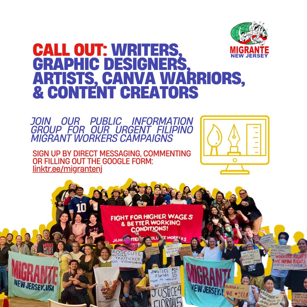 Migrante NJ needs your help in producing digital and offline materials for our urgent Filipino migrant worker campaigns. Currently, we are waging two campaigns: Justice for Florida 15 and Justice for Dhenmark and Jovi Campaigns along side other organizations like Anakbayan North Jersey and Anakbayan Rutgers.