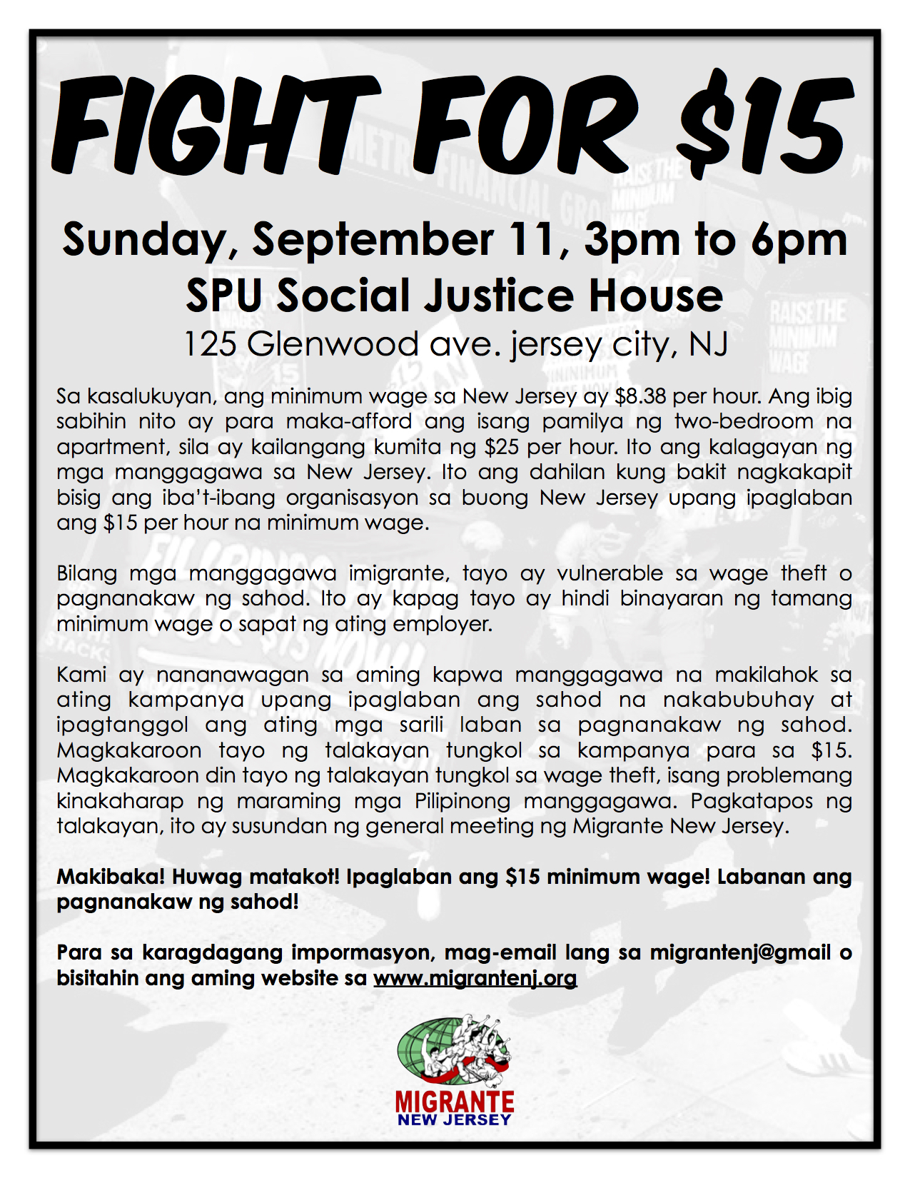 Kami ay nananawagan sa aming kapwa manggagawa na makilahok sa ating kampanya upang ipaglaban ang sahod na nakabubuhay at ipagtanggol ang ating mga sarili laban sa pagnanakaw ng sahod. Magkakaroon tayo ng talakayan tungkol sa kampanya para sa $15. Magkakaroon din tayo ng talakayan tungkol sa wage theft, isang problemang kinakaharap ng maraming mga PilipinongContinue reading “Fight for $15 and Wage Theft Workshop”