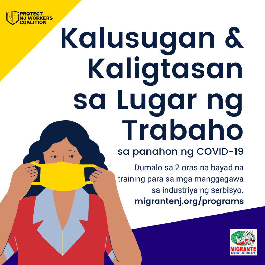 Migrante NJ is a proud member of the Protect New Jersey Workers Coalition. As part of this coalition, we are conducting Health & Safety Trainings to workers in New Jersey. The trainings are two hours, online, and available in Pilipino, English, or Spanish.