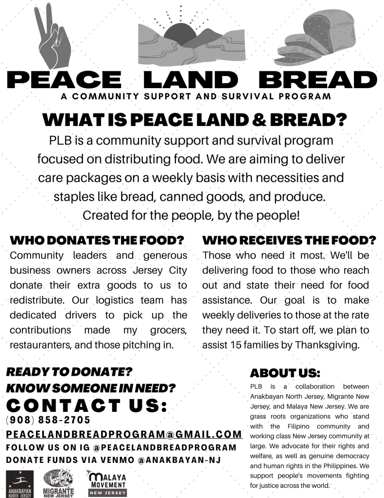 Along with our partners Anakbayan North Jersey and Malaya Movement NJ, we are excited to launch a free food distribution program for Filipino families in Jersey City!